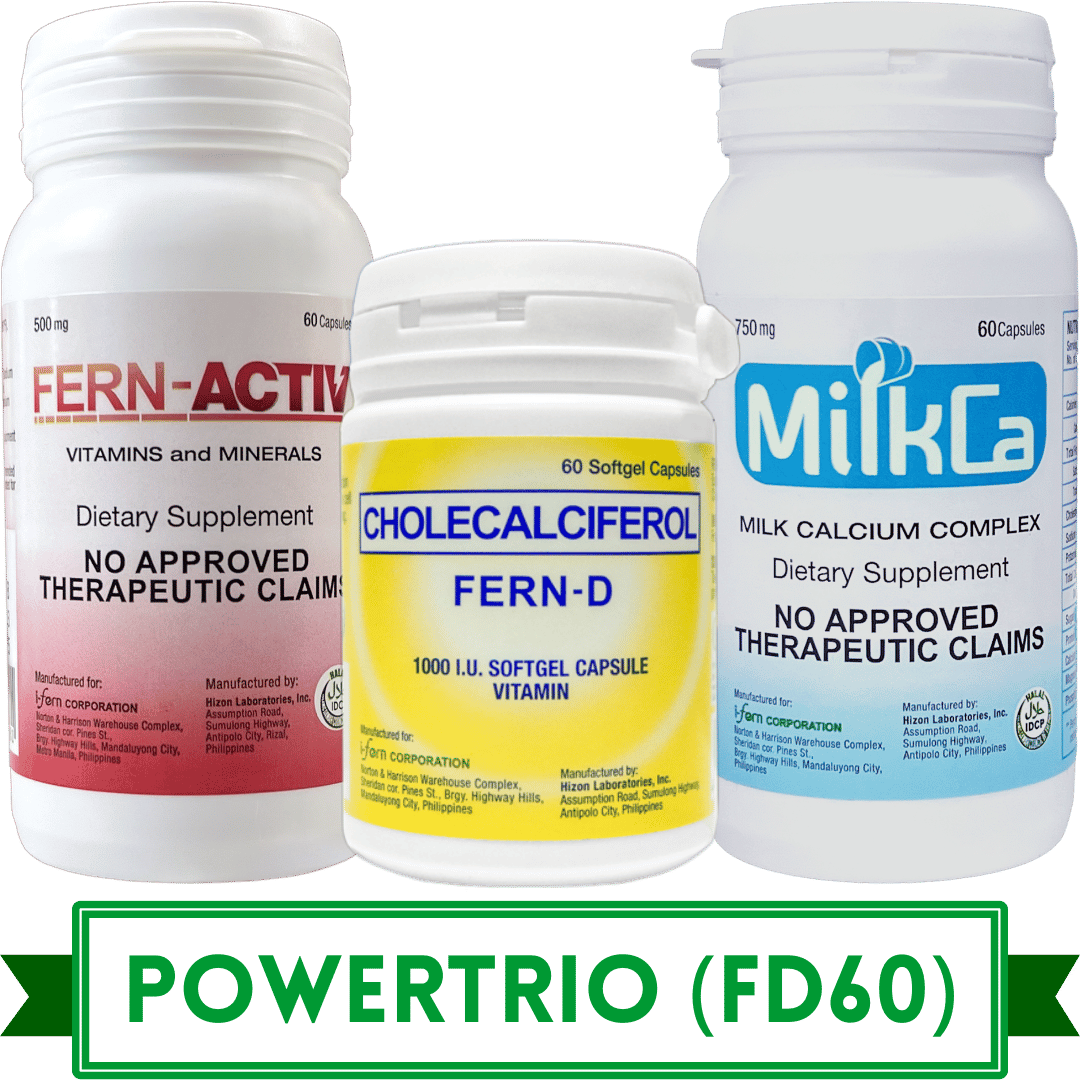 The i-FERN PowerTrio combines FERN-D (Vitamin D3), FERN-ACTIV (Multivitamins with B-Complex, Calcium, Zinc & Vitamin D3), and MILKCA (Calcium from Pure Cowโs Milk with Vitamin D3) to give your body the complete nutrition, energy, and protection it needs every day.